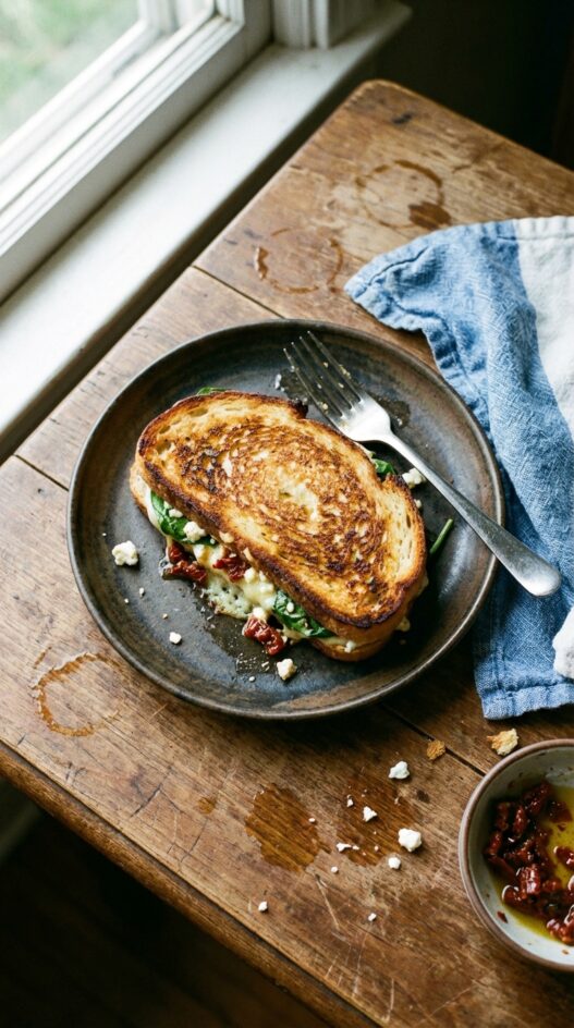 A twist on a classic! Feta, sun-dried tomatoes, and spinach add a Mediterranean flair to this comforting grilled cheese.
