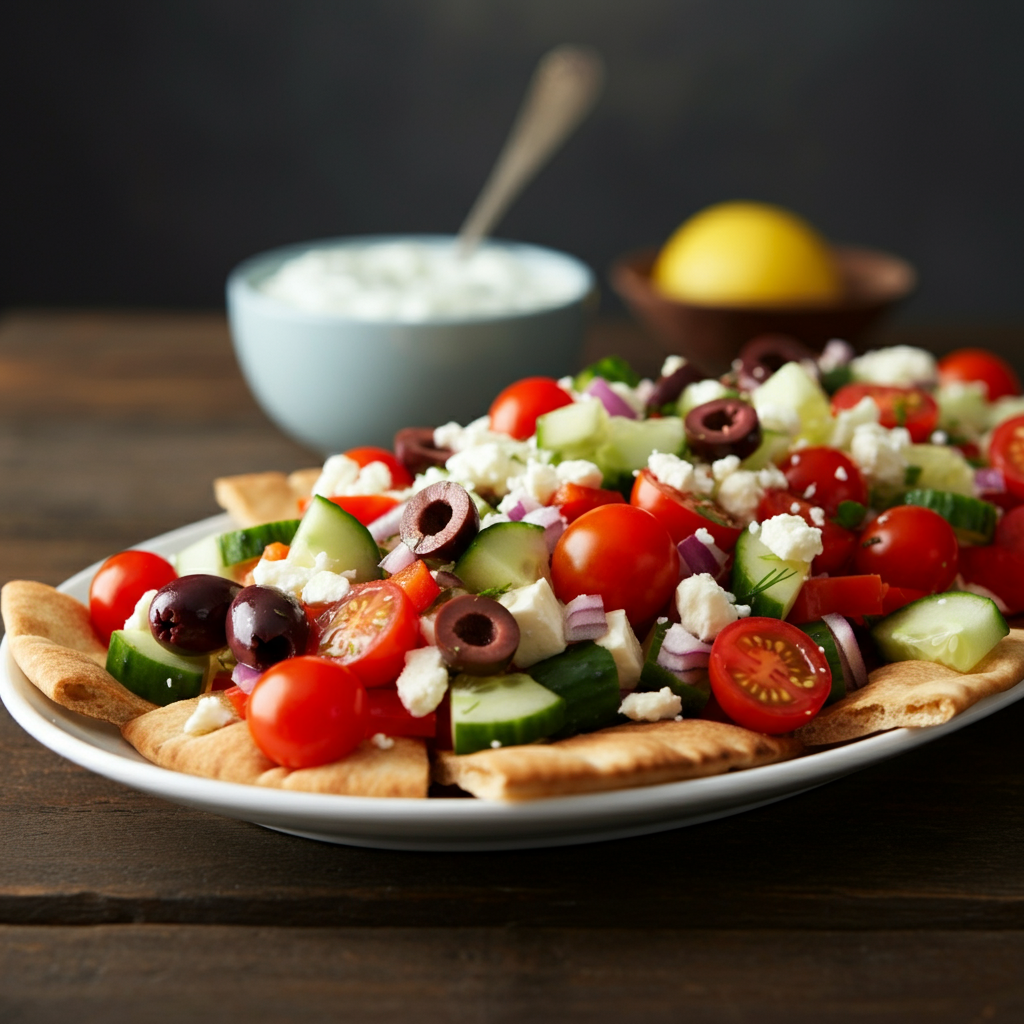 - Top chips with cherry tomatoes, cucumber, olives, pepperoncini, red onion, and crumbled Feta.