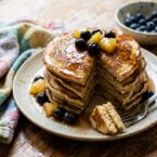 Wholesome pancakes get a delicious upgrade with a homemade pineapple-blueberry syrup. Refined sugar-free!