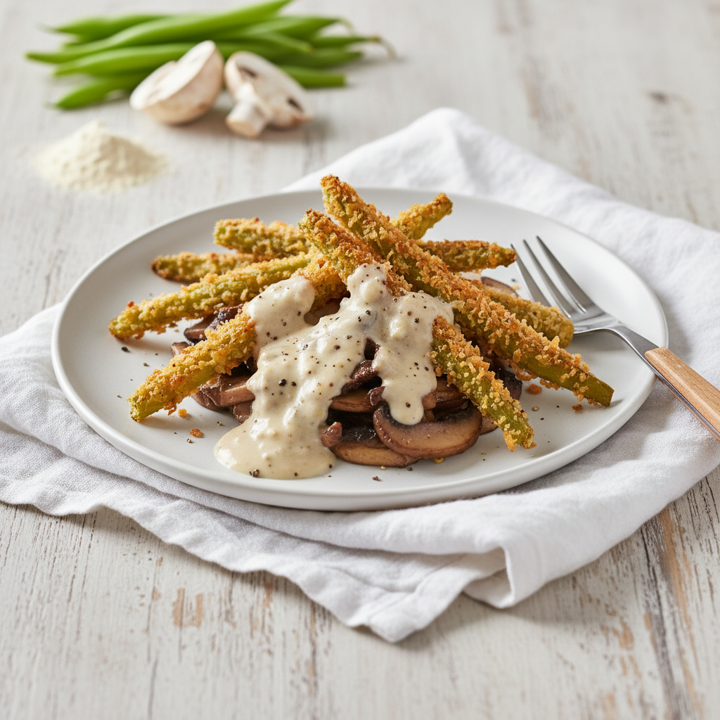 Crispy green bean fries and sautéed portabellas are topped with a creamy mushroom sauce. A unique twist on a classic!