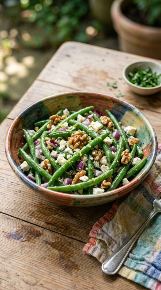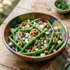 A vibrant green bean salad with crunchy walnuts and salty feta, tossed in a bright lemon-mint dressing. Perfect for summer!
