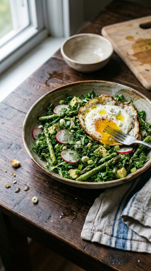 - Layer kale, asparagus, avocado, radishes, green onion, and herbs in a bowl.