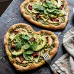 This vegan green goddess pizza is homemade dough loaded with creamy baked hummus on top of salty and nutty basil pesto, this pizza will awaken your senses and make you glow. Wow, a pizza can really do that? Sure it can! Because it’s not full of processed foods we typically put on pizzas. Fresh avocado, baby spinach leaves and baked shaved zucchinis. Topped with roasted sesame seeds. All the nutrients, healthy fats, proteins and fibers are right there on that lovely golden brown baked flatbread.