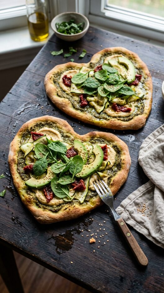 Vegan pizza with vibrant green toppings. Hummus, pesto, avocado, and more!