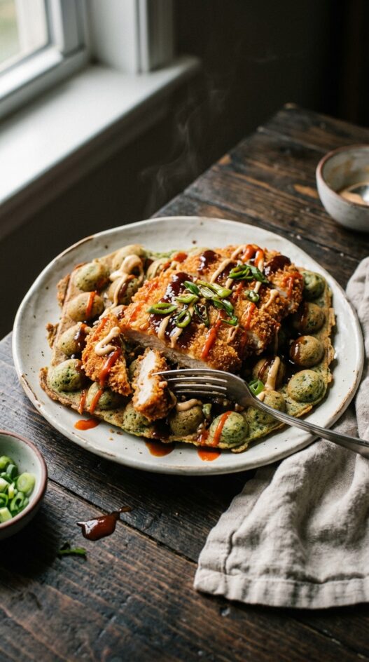 - To serve, slice each chicken cutlet and arrange on top of a waffle. Drizzle with tonkatsu sauce, sesame mayo, and sriracha drizzle. Finish with chopped scallions.