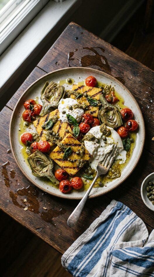 A rustic Italian meal of artichokes that give a delicious earthy, smokey flavor and grilled polenta drizzled with pesto and sprinkled with capers and basil.