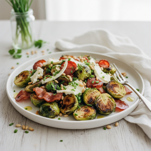 Grate or tear the smoked mozzarella over everything while the sprouts are still warm so it softens slightly. Add balsamic and the pine nuts last so the nuts stay crunchy.