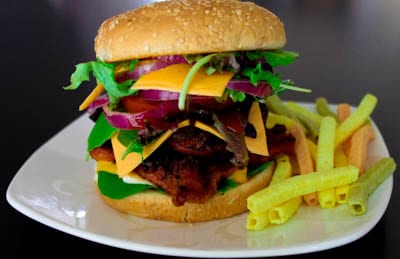 This chicken burger consists of a delicious chicken patty wrapped in the middle of soft buns, veggies and sauces.Try this tasty and delicious quick meal right now.