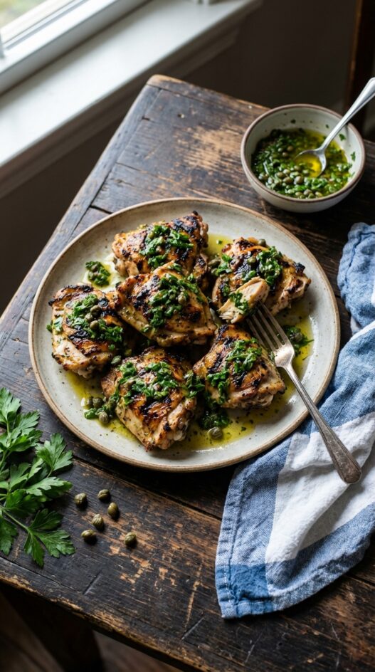 - Marinate chicken: pat thighs dry, season lightly with salt and pepper, and toss with 3/4 cup (180 ml) salsa verde; refrigerate 1 hour. Reserve 1/2 cup (120 ml) salsa verde separately for serving.