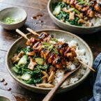 These grilled chicken yakitori bowls are topped with the meat skewers, sautéed greens and cucumber salad. A blissful bowl of flavors.