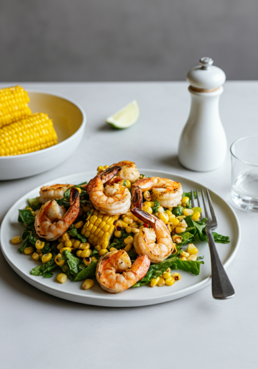 This easy grilled corn and shrimp salad is everything you want in a summer meal. Shrimp, corn, and poblano peppers are grilled to perfection and served atop Boston lettuce mixed with tomatoes, avocado, and lime.