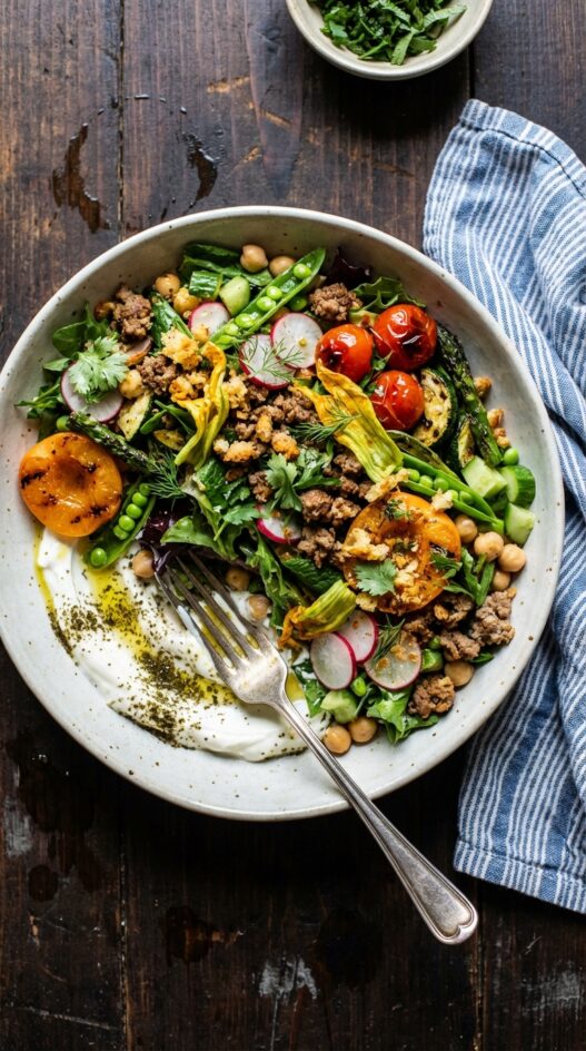 A vibrant fattoush salad gets a smoky upgrade with grilled veggies and lamb. Perfect for a summer gathering or weeknight dinner.