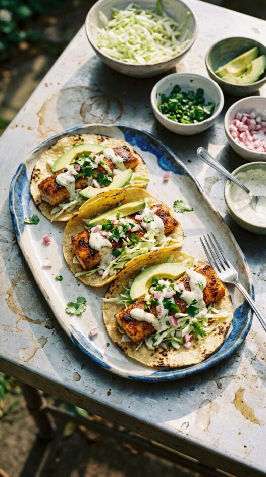 The crema is what holds it all together. It coats every ingredient when you bite down, creamy and tart against the smoky fish and crunchy cabbage. The avocado slices are cool. The red onion is sharp. Every taco tastes layered, not just piled.