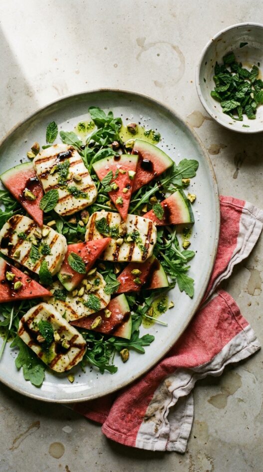 Arugula base, watermelon wedges, warm halloumi on top, then pistachios and balsamic drizzle. Flaky salt last. Don’t dress the arugula heavily; the mint oil is enough and the watermelon releases juice once it sits.