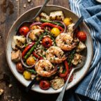 A vibrant summer salad that combines smoky grilled shrimp, charred asparagus and peppers, and toasted ciabatta croutons, all tossed in a tangy red wine vinaigrette.