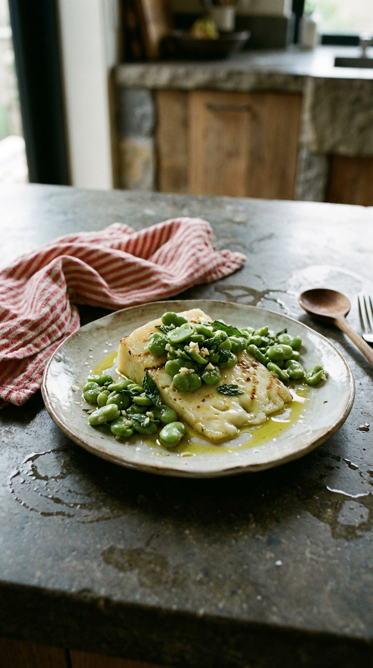 - Place the warm cheese on a plate and spoon the fava beans over it.