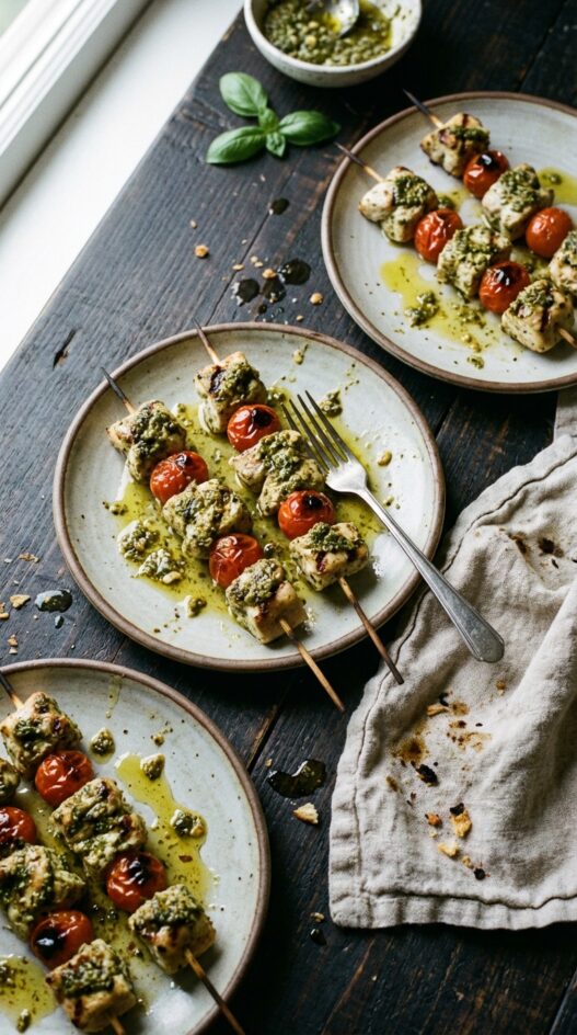 Chicken is easily marinated in pesto and skewered before barbecuing with tomatoes that turn into sweet, smokey bites on the grill.