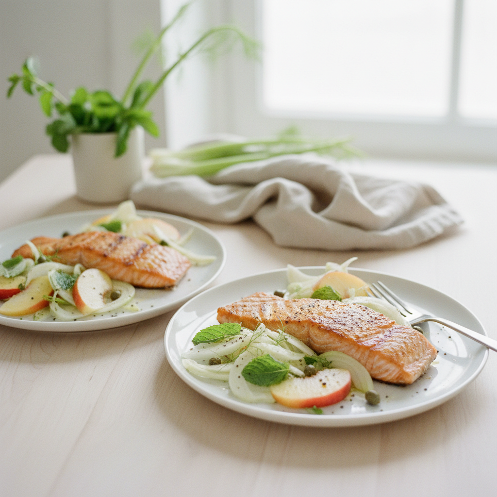 Grilled salmon gets a bright, fresh twist with a fennel and peach salad. Perfect for a weeknight dinner.