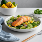 - Combine the grilled corn kernels, cucumber, and slaw mix in a large bowl. Add the flaked, grilled salmon on top.