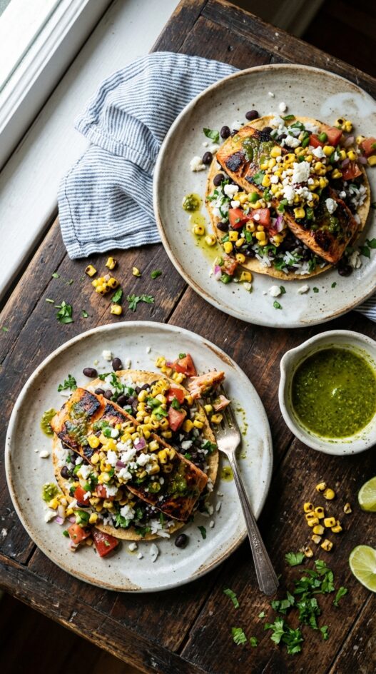- To Serve: Place a couple tostadas on a plate and top with cilantro-lime black beans and rice, salmon, salsa and queso fresco. Serve with remaining mojo sauce on the side. Enjoy!