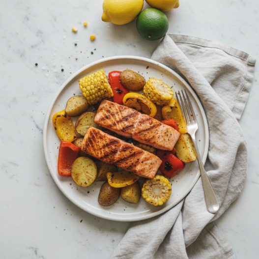 I made this salmon for the first time at a cookout where nobody could agree on what to grill, and it solved the problem without much debate. Salmon in foil with lemon, salt, and pepper, then straight onto the grates once it’s had time to marinate. The vegetables cook alongside it with Creole seasoning and a finish of lime juice, and everything ends up with that char-edged, smoky quality that’s hard to replicate indoors. Corn and peppers on a grill are worth doing anyway, but next to salmon they make a full plate rather than a side.