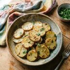 Potatoes aren’t really a traditional staple food in Asia but that doesn’t mean we can’t spruce them up with some Asian vibes! They absorb all the delicious flavors of the soy sauce, sesame oil, lime and ginger and knock them out of the park. And these are really super simple to make. The only time factor is the marinating which can be done the day before. Start by slicing a few large potatoes with a mandolin, russet and Idaho work well, then marinate.