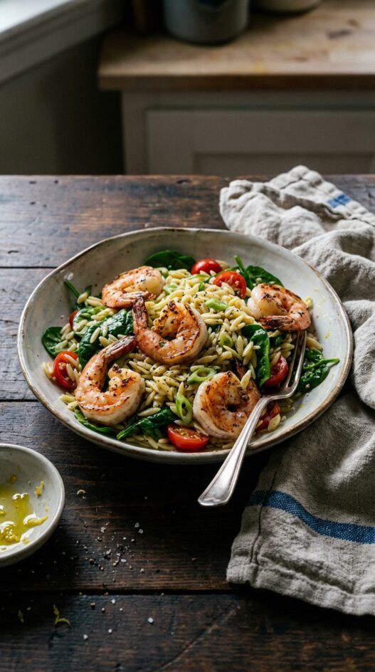 This grilled shrimp orzo salad is a refreshing summer dish, combining juicy grilled shrimp with fresh spinach, cherry tomatoes, and a lemony vinaigrette.