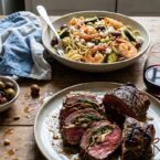 An impressive main course perfect for entertaining, featuring a flank steak rolled with prosciutto, cheese, and arugula, grilled to perfection. Served alongside a vibrant pasta salad with shrimp, zucchini, and feta.