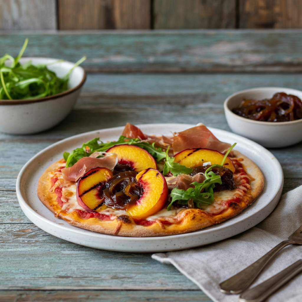 A delightful summer pizza featuring a grilled crust topped with sweet grilled peaches, salty prosciutto, spicy arugula, and rich caramelized onions.