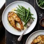This Grilled Sea bass recipe perfectly combines my Italian flair with the flavors of Latin America. Italians love to marinate protein with wine and Chilean sea bass is great with this tasty technique. The wine breaks down the tissue allowing the assimilation of the flavors. Lime juice and mixed herbs enhance the taste of the fish. I paired sea bass with crunchy green beans, previously marinated with Kosher salt and garlic, then quickly grilled. This easy recipe is great for your barbecue party! It needs to be marinate only a few hours, which makes it possible to prepare both fish and green beans in advance at home, or directly into a cooler bag.