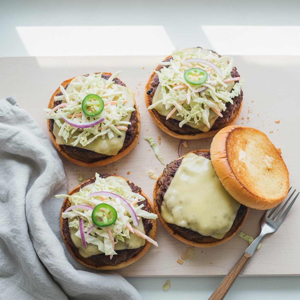 - Place the burgers onto buns and top with coleslaw.