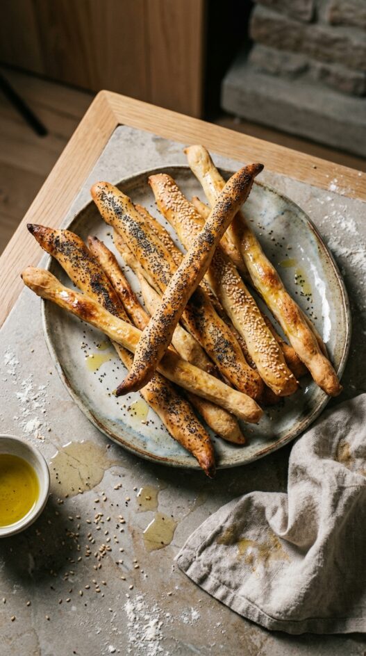 - If you'd like, you can sprinkle with sesames or poppy seeds, and roll the breadsticks so the seeds stick to the dough.