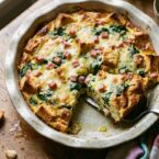 The past couple of months I have been making a habit out of baking a breakfast casserole early in the week and eating it all week long. The thing I love about doing this is that not only can I throw whatever meat, cheese, and veggies I have on hand in the casserole, but it’s practically a no-brainer every morning. Better yet, I don’t have to think about what to feed my kids for breakfast, either. Just reheat and eat!
