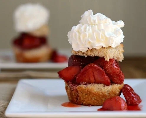 I paired these strawberries with a simple and healthy drop biscuit. The biscuits feature whole wheat flour, reduced fat milk, and less butter than typical biscuits so this dessert is practically guilt-free. Making the biscuits in a muffin pan is a little trick I like to use for a prettier presentation. You can also drop them straight onto the baking sheet. They will be equally delicious.