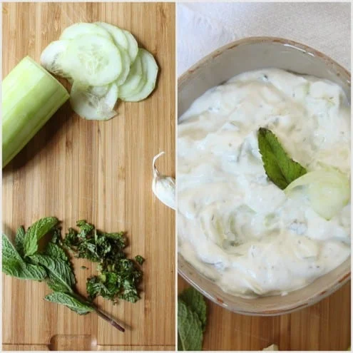 - Combine the drained yogurt, cucumbers, garlic paste and the remaining ingredients.