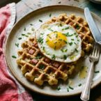The batter is ready fast. Ten minutes of prep, ten minutes on the iron, and you have a platter of crisp, golden waffles with pockets of melted cheese and little bursts of chive running through every bite. They hold up well on their own, but a fried egg on top never hurts.
