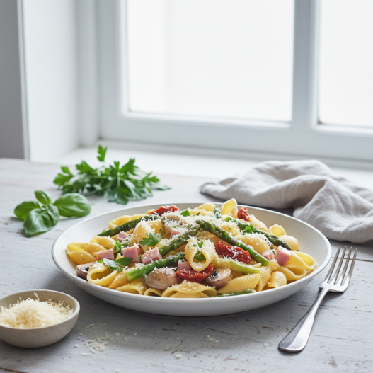 - Stir in the asparagus, mushrooms, sun-dried tomatoes, and ham. Heat through over medium heat.