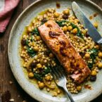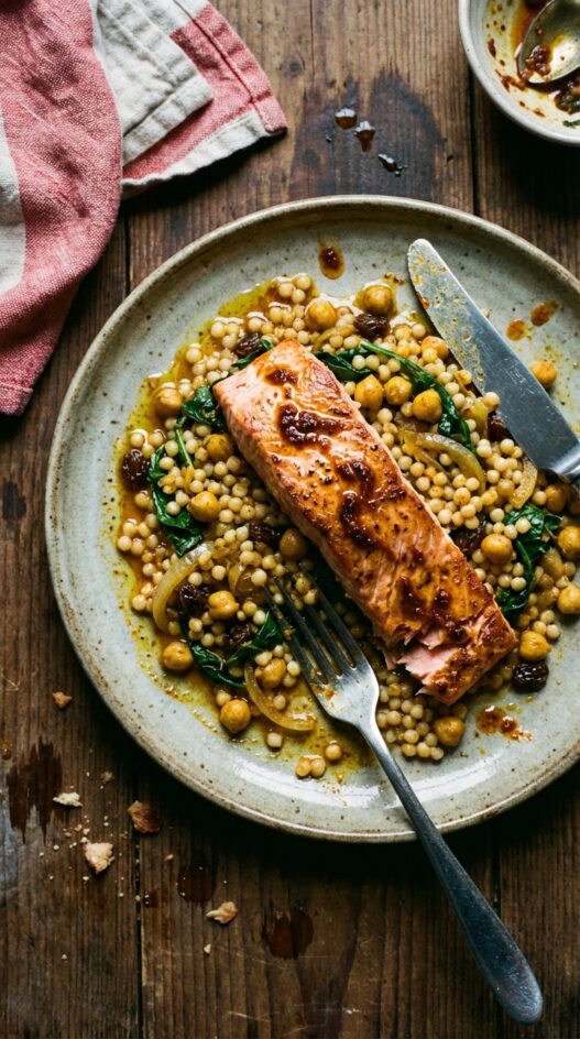Israeli couscous has more texture than regular couscous. The pearls are larger and chewier, almost pasta-like, which means they hold up against the chickpeas and wilted greens without turning mushy. Turmeric, cumin, cinnamon, and paprika give the chickpeas warmth without overpowering the salmon. Raisins add pops of sweetness that balance the spice.