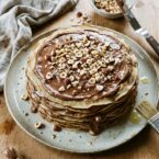 Layered high with whatever filling your heart so chooses, be it creamy mushrooms and onions or thinly sliced apricots and whipped mascarpone {you should be taking notes people…), this towering beauty is fairly simple to make, despite the often-finnicky process of making crepes yourself. Between the dough I layer silky homemade whipped cream that has been tinted ever so slightly with Frangelico and everyone’s favorite spread: Nutella.