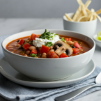This rich and savory tortilla soup features earthy portobello mushrooms and hearty pinto beans, pureed into a velvety base. Garnish with crispy tortilla strips and fresh avocado for a satisfying meal.