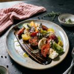 Bursting with fresh flavors, this elegant salad features NC heirloom tomatoes, creamy mozzarella, and a unique black garlic-balsamic emulsion.