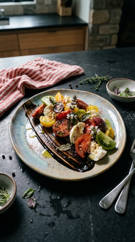 Dress it just before serving. Salt draws moisture from the tomatoes quickly, and the mozzarella is best at room temperature. Slice and arrange everything in advance, then add oil and seasoning at the last moment.