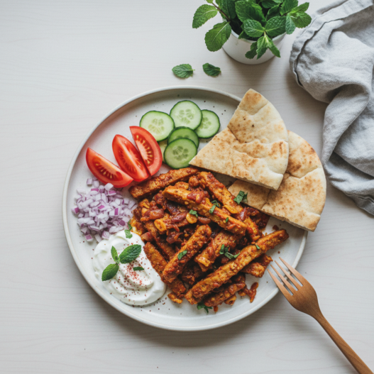A tahini-based sauce or garlic yogurt sauce complements the flavors of the seitan and fresh salad perfectly.