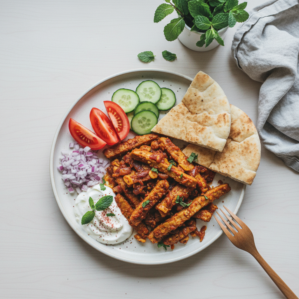 - To serve, warm pita bread, spread with Greek yogurt, add the seitan shawarma, and top with the salad mixture. Roll or fold and serve warm.