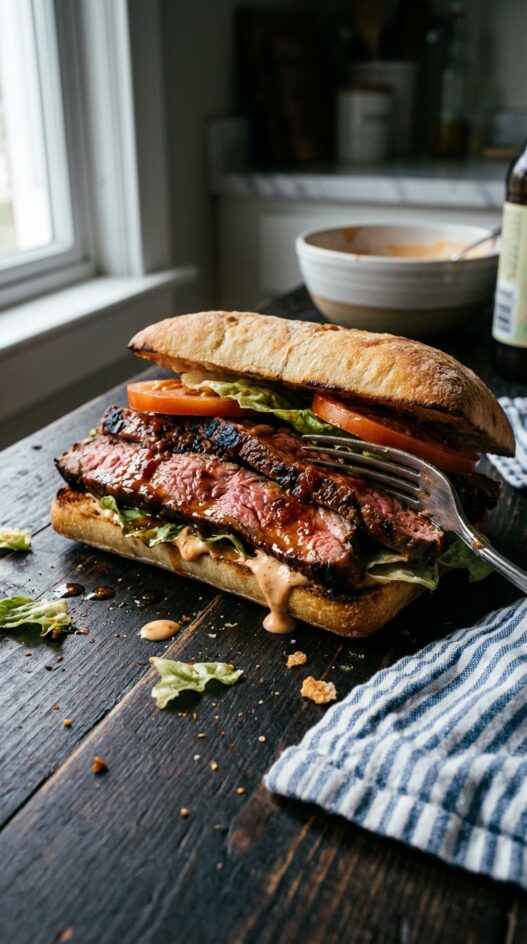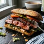 Skirt steak marinated in IPA, sriracha, lime, cumin, and chipotle. Left overnight, grilled hard, rested, sliced thin against the grain. On ciabatta with whatever you want on top. This is a sandwich for people who think sandwiches are serious food. The beer in the marinade does two things: it tenderizes the meat and adds a bitter note that balances the brown sugar and heat. Use a proper IPA with actual hop bitterness; something bland produces a flat marinade. Flank works if you can’t find skirt. Both need to be sliced against the grain or they’re tough regardless of how well you marinated them.