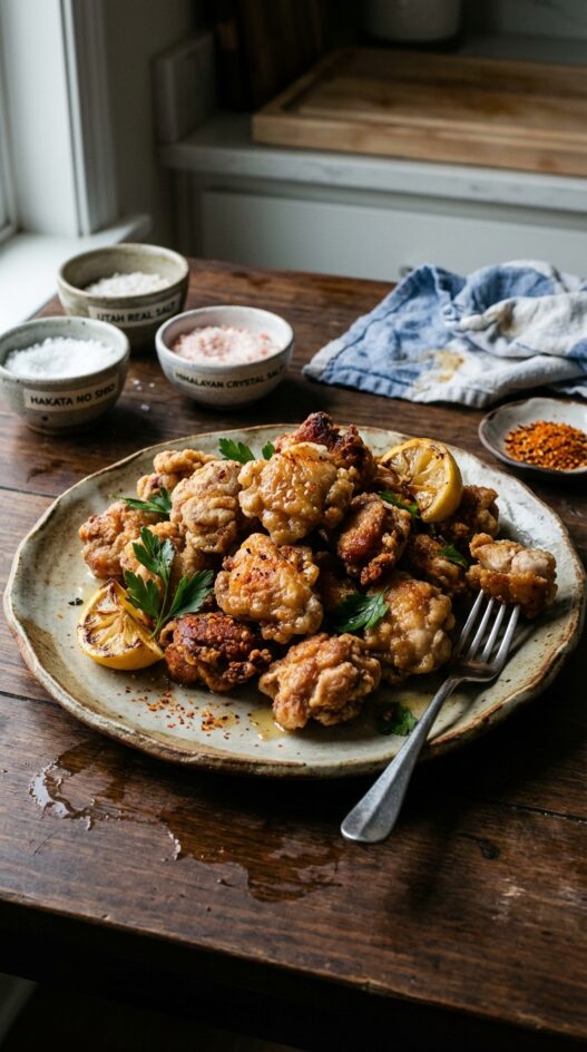 - Arrange the fried chicken on a warmed serving platter. Garnish with lemon wedges, parsley, and a sprinkle of shichimi togarashi. Serve immediately with your choice of salt varieties on the side for dipping.