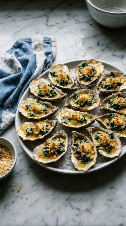 For Oysters Rockefeller, select fresh, medium to large Gulf Coast or Pacific oysters, as their brininess complements the rich herb-infused topping.