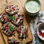 - While the chocolate is still warm, decorate the cookies with red currants, puffed millet, and mint leaves, pressing them onto the melted chocolate.