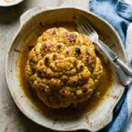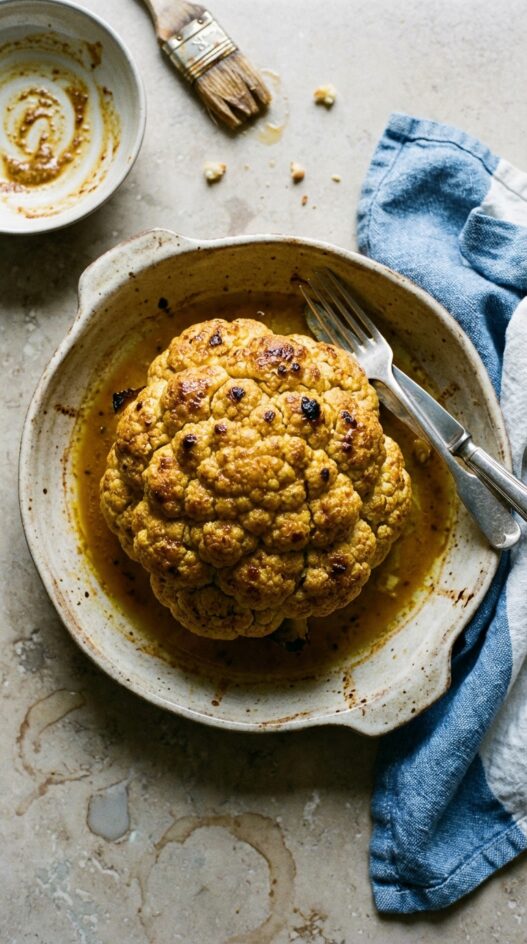 Cauliflower gets a bad reputation. Overboiled into mush, roasted without seasoning, served as an apology for not having anything else. Roast it whole with a Dijon and smoked paprika crust and it becomes a different vegetable entirely. The outside chars slightly. The inside steams in its own moisture. It takes about an hour at 375°F and comes out looking like something you’d serve to guests, which you can. This recipe is vegan and gluten-free by default, and it works as a main for two or a side for four.