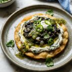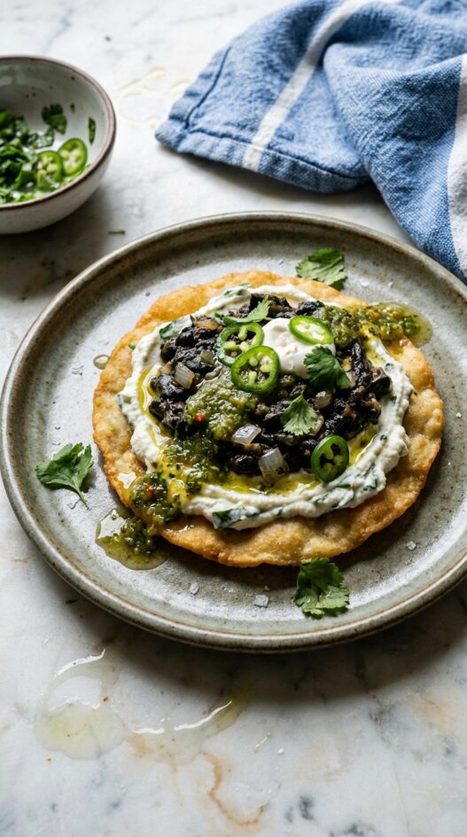 - Assemble the Sopes: Place a fried sope on a serving plate. Spread 1 tablespoon of the prepared ricotta epazote mixture as the base. Add a generous spoonful of the huitlacoche filling on top of the ricotta. Drizzle a little mint salsa verde over the huitlacoche. Garnish with a few slices of serrano chili, fresh cilantro leaves, and a small dollop of creme fraiche if using. Sprinkle Maldon salt and drizzle with extra virgin olive oil to finish.